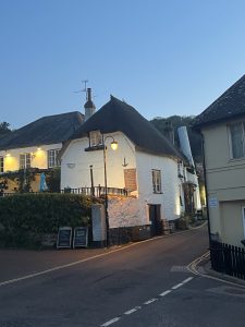 The fact that there’s a pub there (the second part of the above information) somehow speeds up the descent, and soon I’m standing in front of the Coombe Barton Inn, classically located on the quay with a large beer garden. It’s Saturday evening, and the bear is just putting on his tap shoes. Inside, a live band is setting up their equipment.