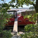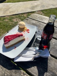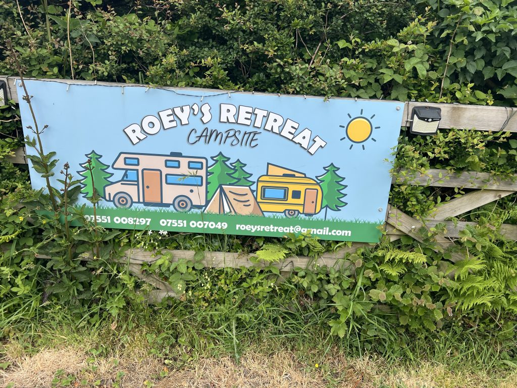 I’ll take a shortcut and still end up standing in front of the 200 steps that conclude the stage, leading to the top of Boscastle. And to top it all off, I won’t even make it to Boscastle today. Because after the aforementioned 200 steps (not figuratively, really 200), you soon pass a farm that, in addition to a farm shop, also operates a farm café that this jaded retiree can’t resist. There you’ll find the most magnificent cakes, tarts, and pies. A raspberry and cream concoction wins the vote and is inhaled, quite unstylishly, with a cold Coke outside in the sun. Having already settled the question of today’s accommodation the evening before – a farm campsite not far from Boscastle – we now take a closer look. And lo and behold, the opulent farm café is located right on the country road leading to the farm, and from here, we’re already halfway there. So, after consuming this delicious sugar fix, I naturally don’t return to the path, but take the country road under my dusty hiking boots and reach my destination after just under a mile. A „working farm“ with camping as a sideline, like most farm campsites. There’s still not much going on here either; apart from me, there are only two or three campervans in the entire field. Very nice new facilities, a friendly farmer’s wife who checked me in, a great price (10 £), and the farmhand got me an adapter for charging my devices at one of the RV electrical outlets. All good!