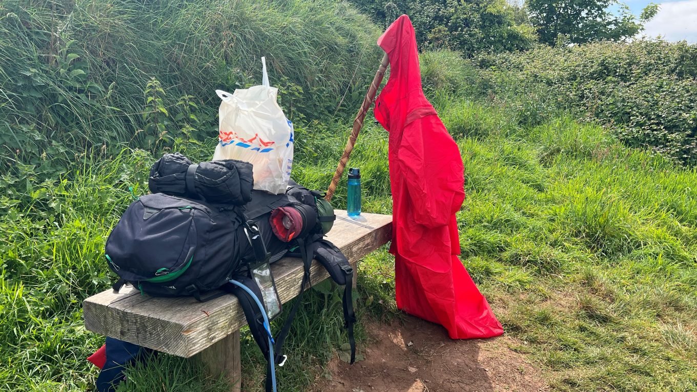 Das knallrote Teil wird zusammengerollt und zu meinem Zelt unter den Rucksack geschnallt. Ob das hält?