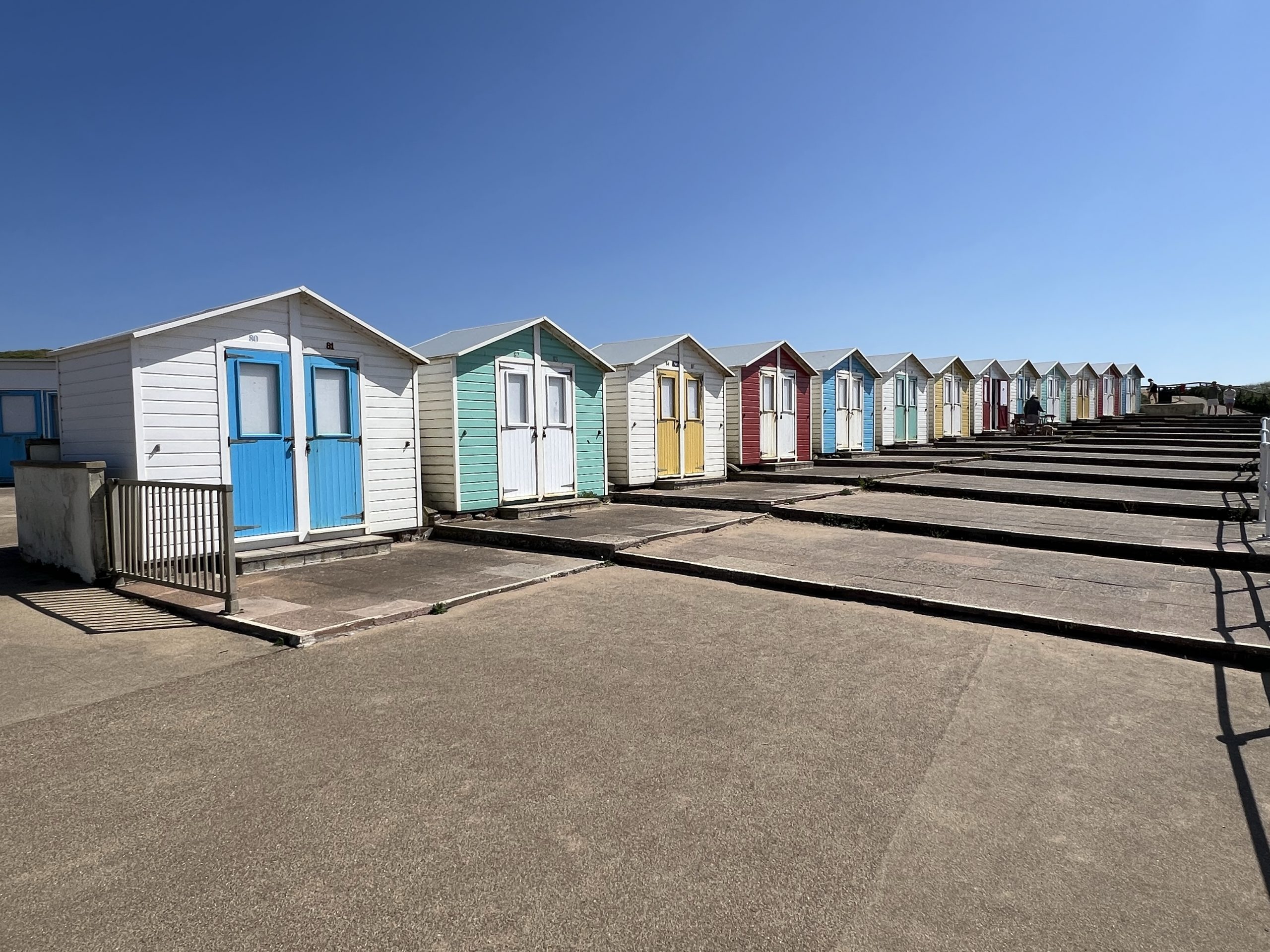 Als ich die Anlage dann endlich passiert habe ist es auch tatsächlich nicht mehr sehr weit bis zum Tagesziel Bude. Irgendwann ein letzter Abstieg und dann ich stehe am Strand, der sommerlich-bunt von Strandhäuschen in allen Farben gesäumt ist.