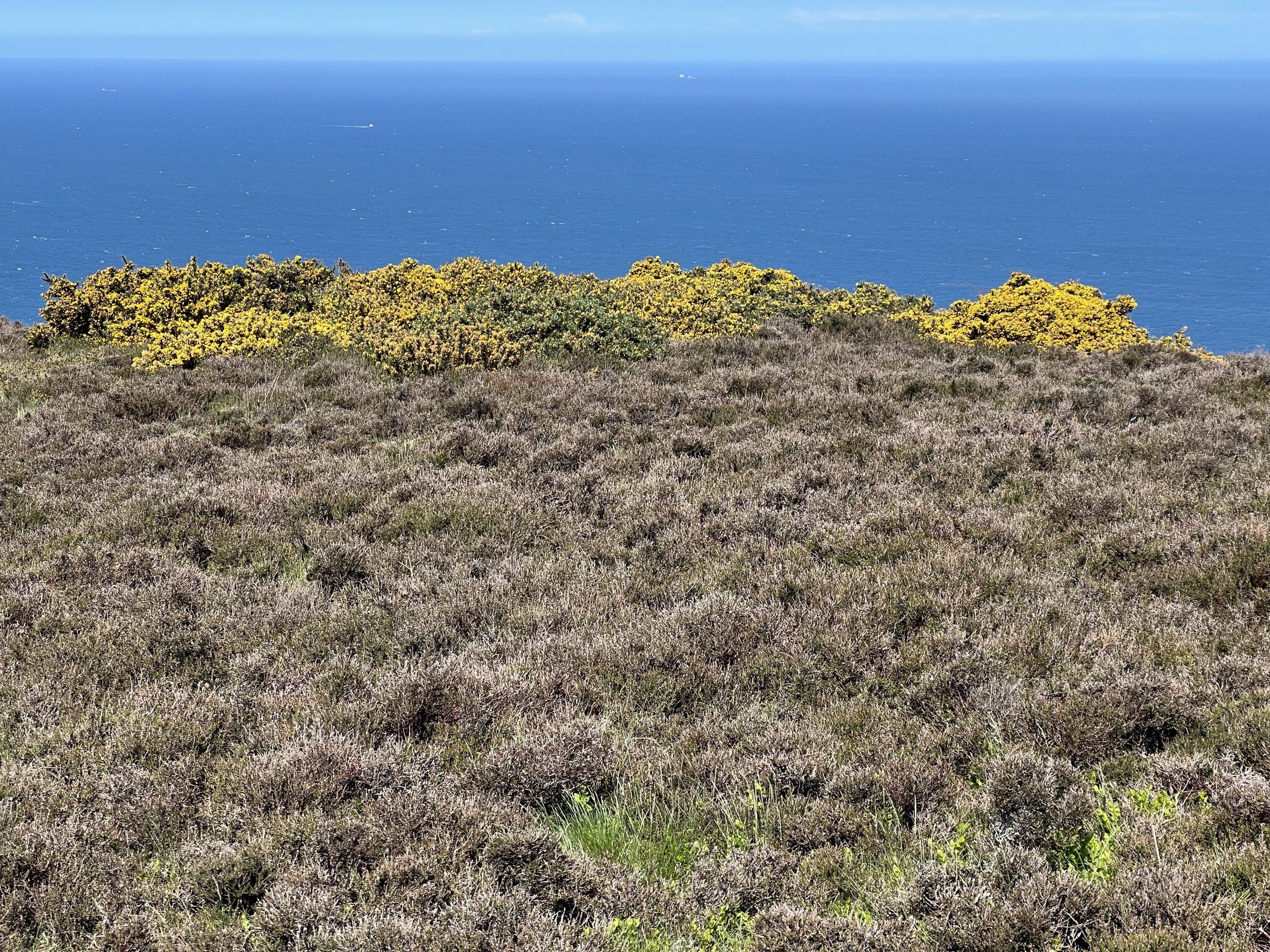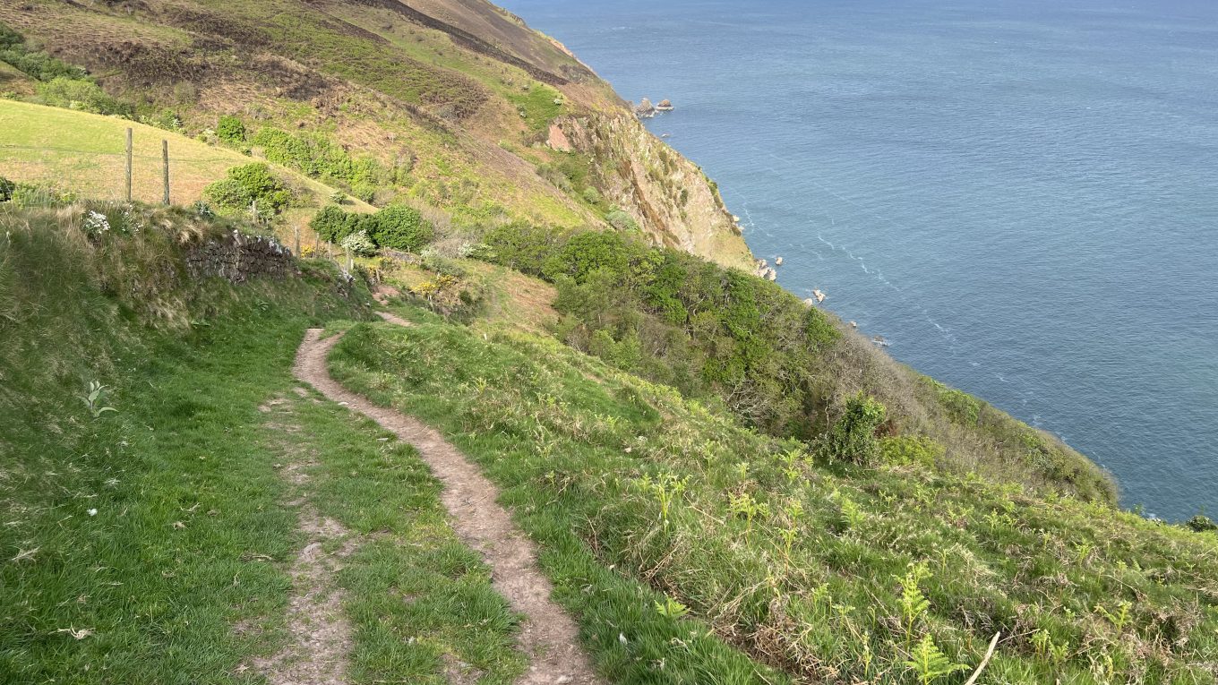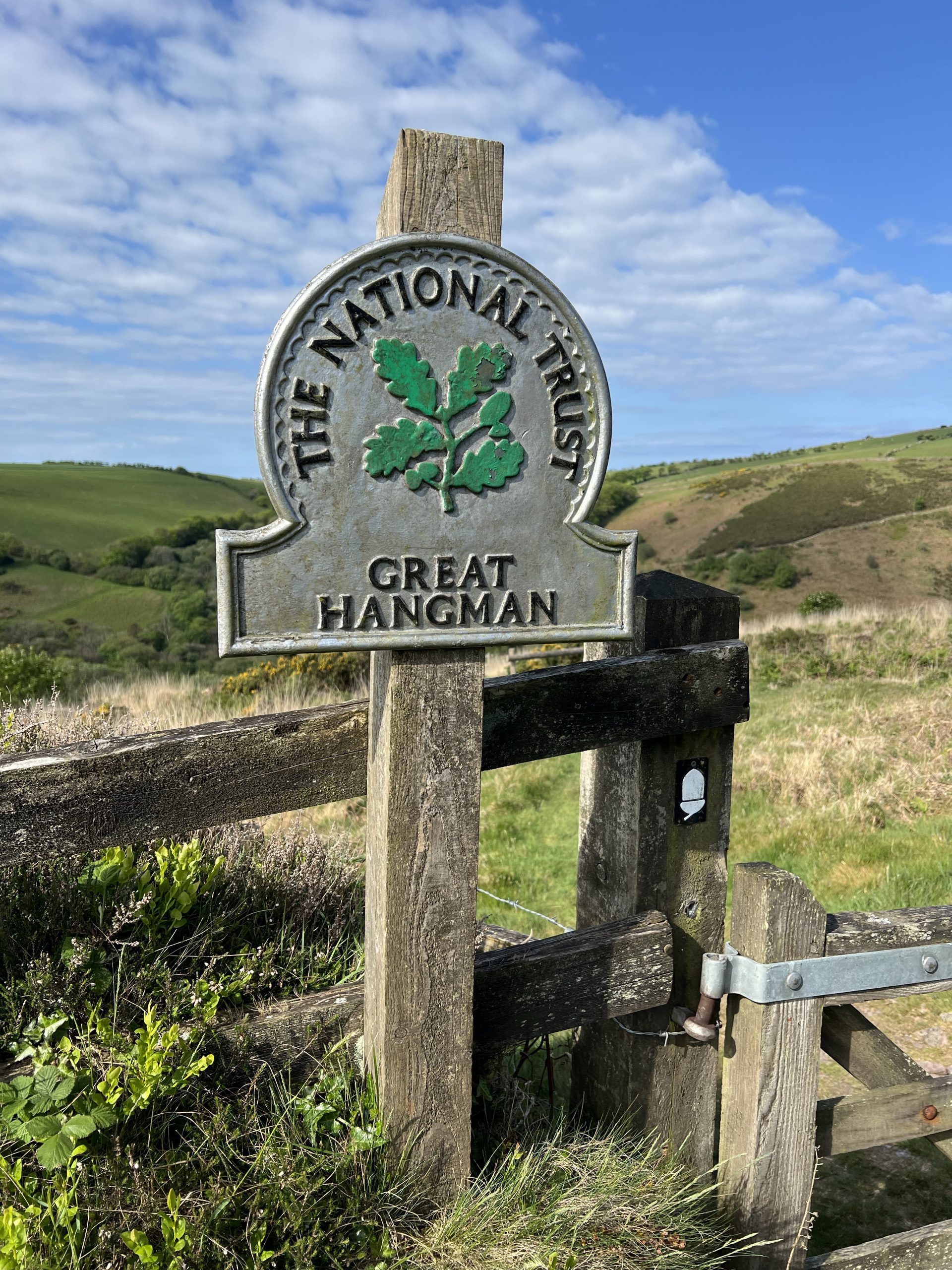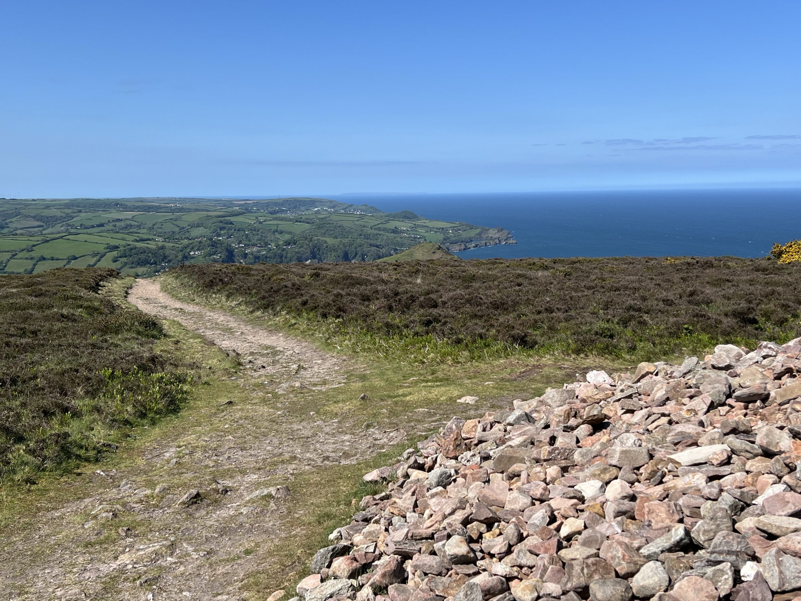 Dann geht es aber mit frischem Mut weiter und diesmal sogar eine Weile ziemlich geradeaus oben auf den Klippen, der Great Hangman wartet. Dazu muss aber erstmal wieder abgestiegen werden – steil natürlich – und dann hat man den großen Henker vor sich. Auch wenn er die höchste Erhebung auf dem SWCP ist, der Anstieg ist zwar lang und stellenweise steil, gehört aber nicht in die Killer-Kategorie. Der Gipfel wird von einem großen Steinhaufen markiert, von hier aus geht es überwiegend abwärts nach Combe Martin.